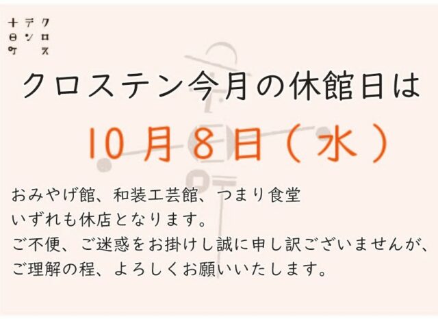 おみやげ館、和装工芸館(和の小函、無印良品コーナー)オンラインショップ・クロステン十日町も休店となります。