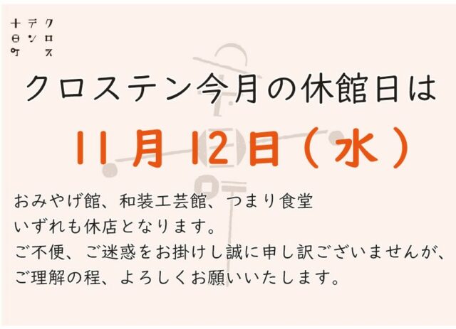 おみやげ館、和装工芸館(和の小函、無印良品コーナー)オンラインショップ・クロステン十日町も休店となります。