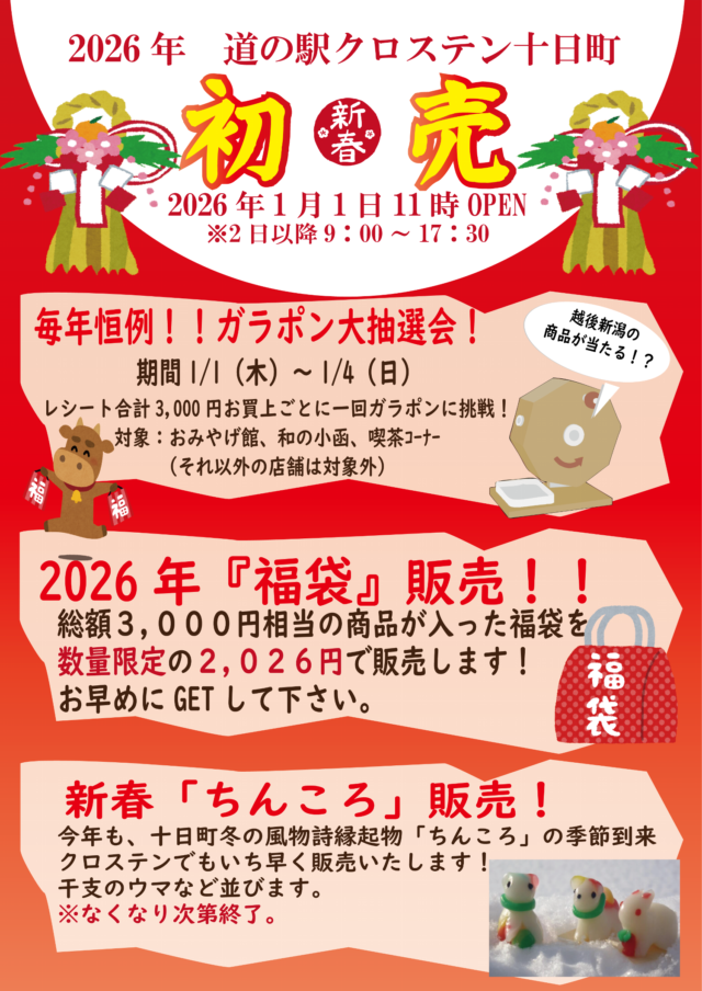 2026年新年初売り企画!! 2025/12/30 ツイート 2026年新年は1/1(木)より営業いたします。 初売り企画としまして 〇毎年恒例!!ガラポン大抽選会! 〇2026年『福袋』販売! 〇新春『ちんころ』販売 ご来店お待ちしております。