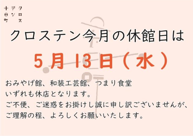 おみやげ館、和装工芸館(和の小函、無印良品コーナー)オンラインショップ・クロステン十日町も休店となります。